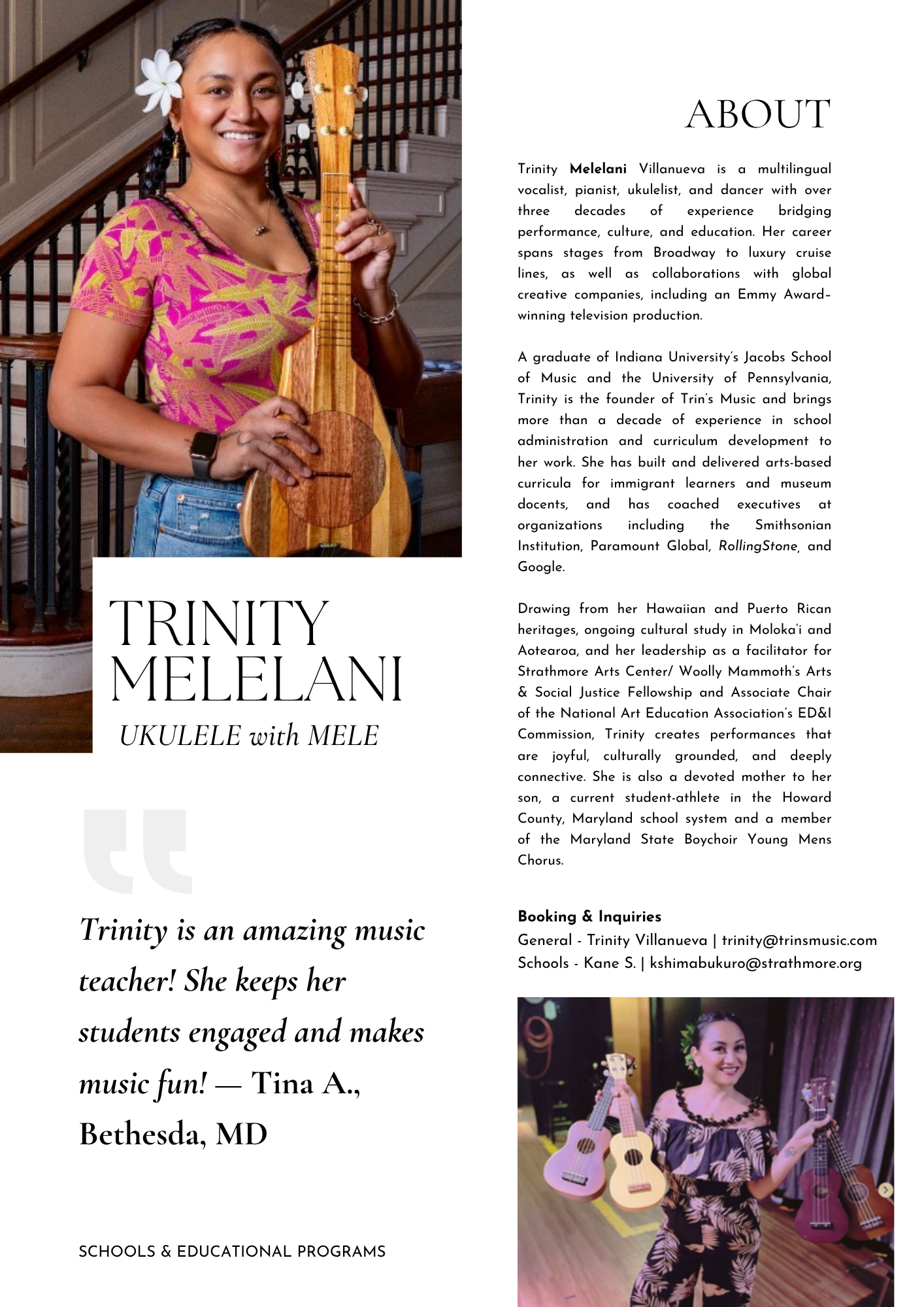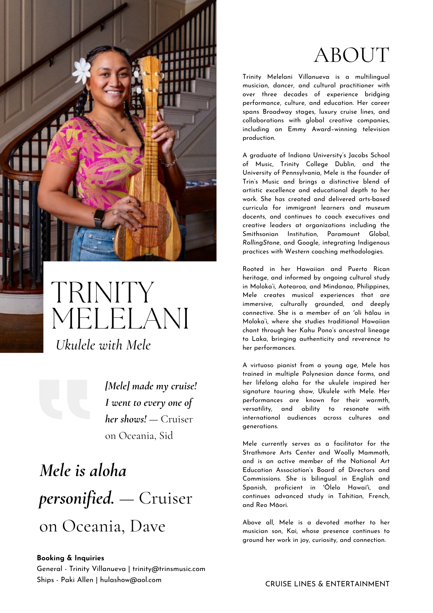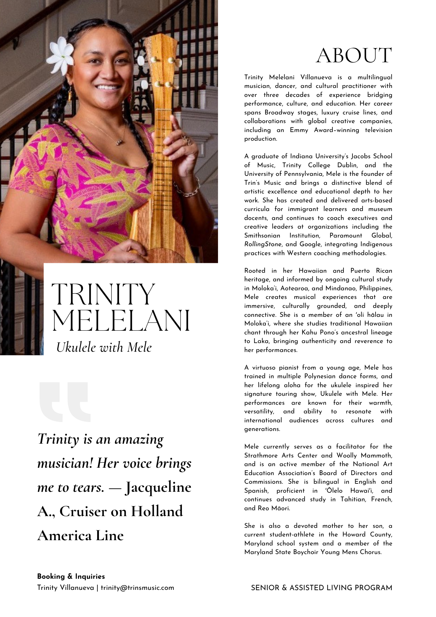 A 45-minute shows featuring songs from the Caribbean, the Americas, and Polynesia. Utilizing both the ‘ukulele and the piano—Mele uses her classical and jazz skills infused with island to recreate showstoppers for the audience.